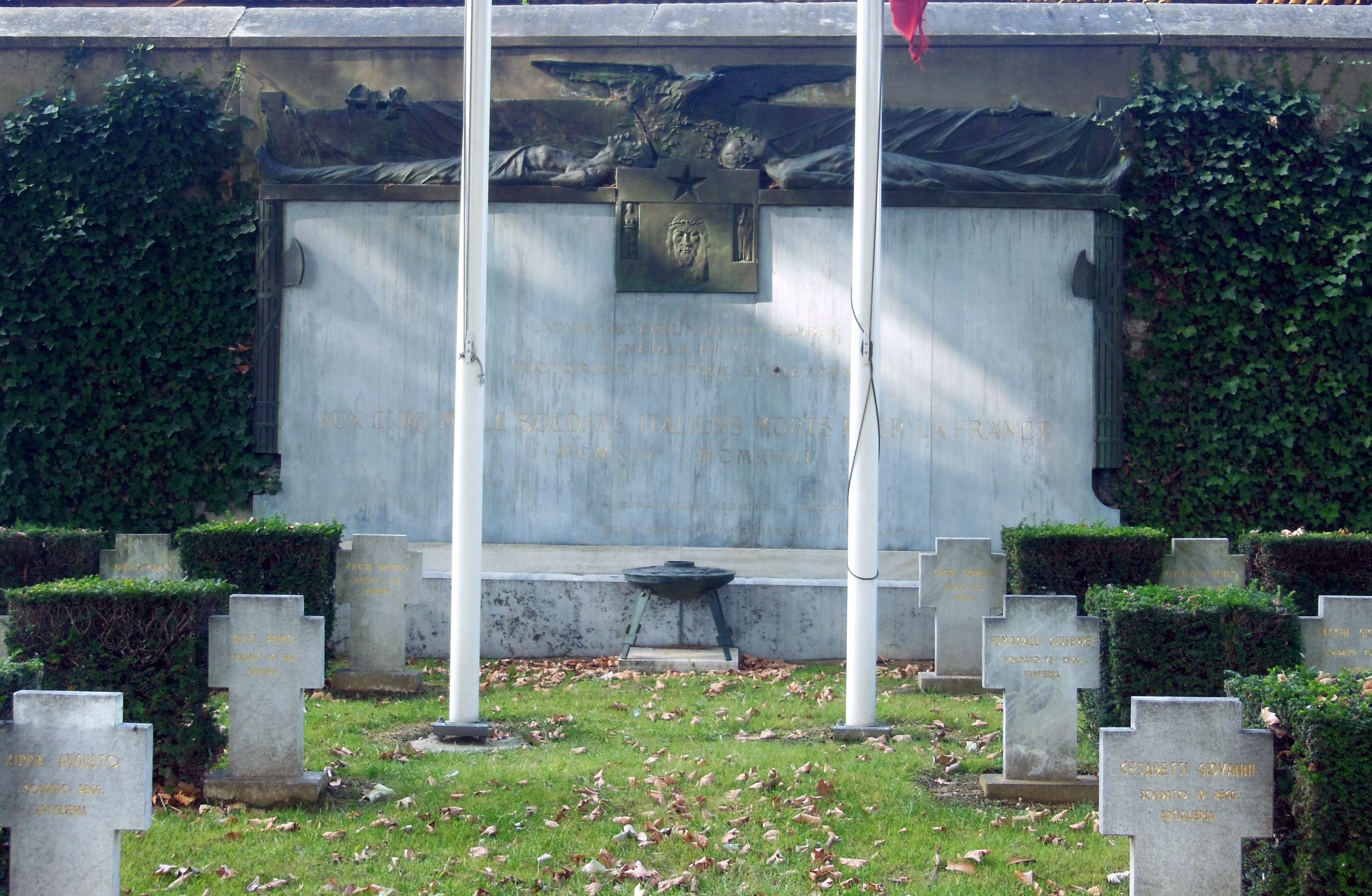 Le monument est situé dans le cimetière parisien d’Ivry, 44, avenue de Verdun, 94200 Ivry-sur-Seine, enclos nord, avenue nord. Il se trouve dans le carré militaire italien, contre le mur d’enceinte du cimetière. Ce vaste monument en l’honneur des soldats italiens morts pour la France est composé de grandes plaques en marbre posées sur un soubassement saillant en béton. Là se trouve l’épitaphe en latin puis en français. L’ensemble est encadré par deux grands faisceaux de licteurs en bronze. Épitaphe en français : AUX CINQ MILLE SOLDATS ITALIENS MORTS POUR LA FRANCE MCMXIV MCMXVIII Il est surmonté d’un groupe en bronze où se trouve au centre un aigle tenant des couronnes de chênes de ses griffes. Puis, juste en dessous, l’étoile symbole de l’Italie et après, un visage du Christ mort encadré de deux figures féminines. De part et d’autres de l’aigle, deux soldats décédés, le corps couvert d’un linceul. À l’arrière, des drapés tenus sur des lances ferment l’ordonnance générale du monument. Cet impressionnant monument a été financé par la section parisienne de l’Associazione nazionale combattenti.